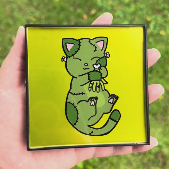 Franken-Kitty / Zombie Cat 4x4 inch Glass Frame Painting ✨